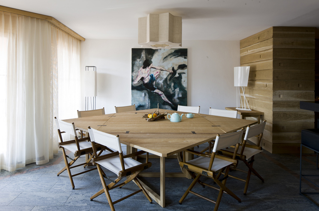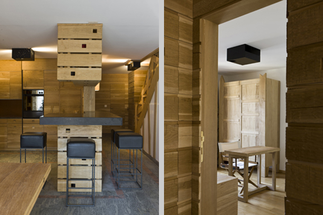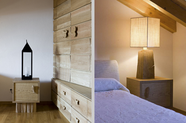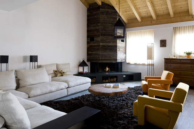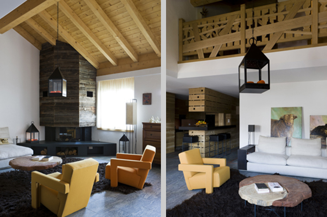 E' stata occasione per ripensare all'architettura delle Alpi, ai ferri di antichi attrezzi, ma anche per giocare con immagini biomorfe intagliate nel legno o ritagliate in una pelliccia ecologica per il tappeto del soggiorno.