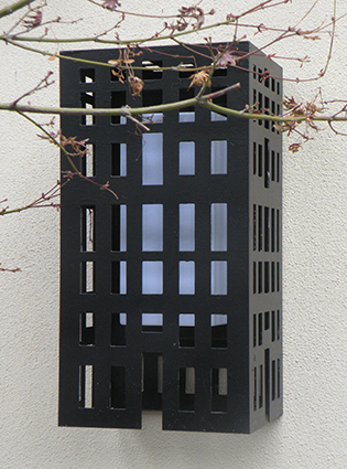 Un parallelepipedo in lamiera di metallo verniciato, solcato da piccole aperture, ricordo di facciate architettoniche, contiene un parallelepipedo luminoso in metacrilato.