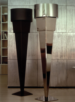 Lampada da terra a luce indiretta, memoria di architetture costruttiviste realizzato in lamiera di metallo di diverse finiture.